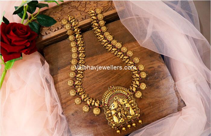The 22K Gold Temple Haram from Vaibhav Jewellers is beautifully crafted, showcasing traditional designs…