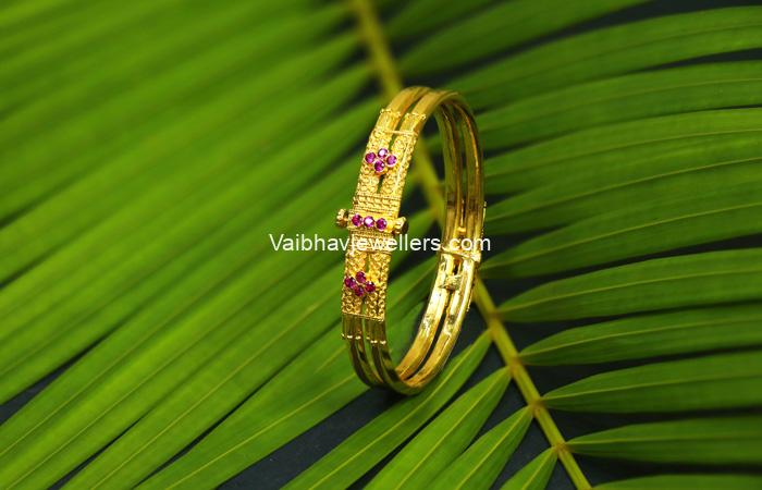 - Traditional Antique Gold Kada Set – Check out these South Indian antique bangles with price. The kada set is carved and engraved with beautiful designs that run all through the bangle. A floral motif with a red gemstone is placed at the center of the bangle to add to the traditional and antique look.