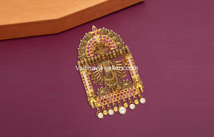 The various designs offered by Vaibhav Jewellers aims to meet the taste and requirement of every woman. The criteria for choosing the right piece varies depending on South Indian antique pendant designs with Price and weight. From the tiny light ones to the oversized South Indian antique pendant designs, they weigh from 2 grams to 90 grams. Such South Indian antique pendant designs range from ₹3000 and go up as high as ₹6,93,000 approximately.