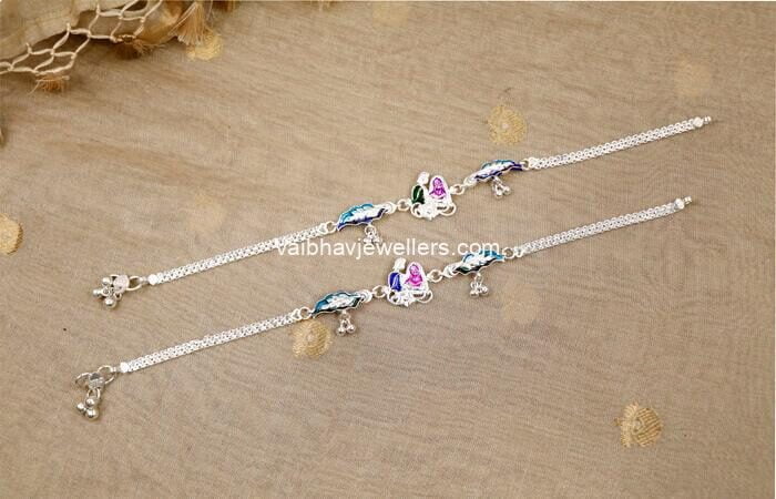 These Antique Silver Chain Type Fancy Anklets from Vaibhav Jewellers are beautifully crafted, featuring intricate chain designs that enhance any outfit. Perfect for festive occasions, they add elegance and charm while celebrating the beauty of traditional silver craftsmanship.
