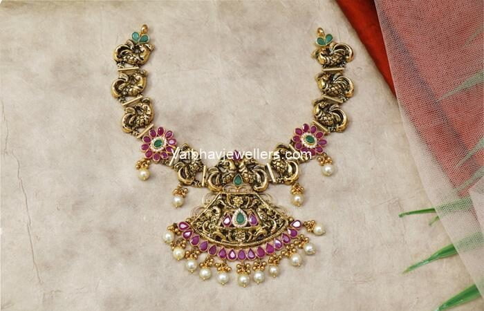 The Majestic Dynasty Antique Gold Haram from Vaibhav Jewellers is a beautifully crafted piece that showcases intricate designs and an antique finish. Ideal for weddings or festive celebrations, it adds a touch of elegance and cultural significance to any outfit while celebrating traditional Indian artistry.
