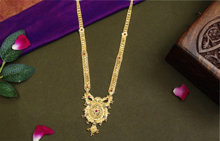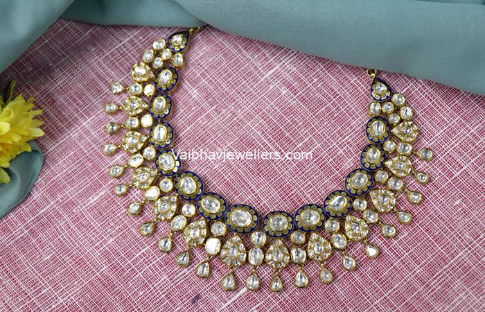 This 18Kt Jadau Polki Necklace from Vaibhav Jewellers combines traditional craftsmanship with modern elegance. Featuring intricate jadau and polki work, this necklace is perfect for weddings or special occasions, adding a touch of glamour and sophistication to any outfit. The detailed craftsmanship ensures that this piece is a cherished addition to any jewellery collection.