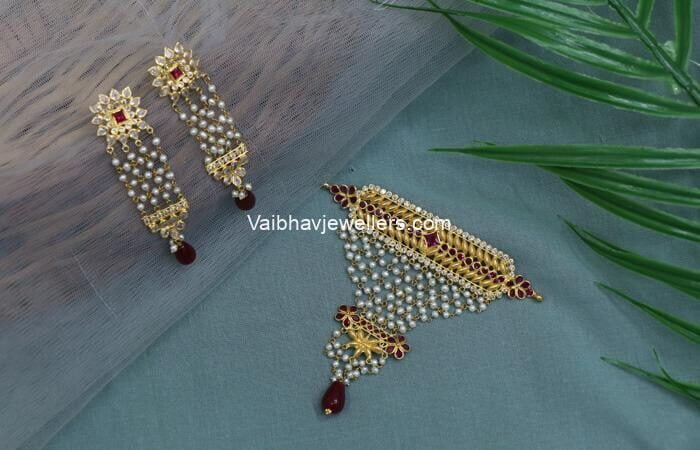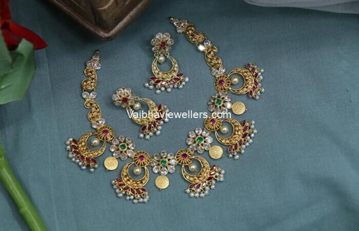 This 22K Gold Semi Precious Necklace from Vaibhav Jewellers features beautiful semi-precious stones, showcasing exquisite craftsmanship. Ideal for festive occasions, it adds a touch of elegance and charm to any outfit while celebrating the beauty of traditional jewellery.