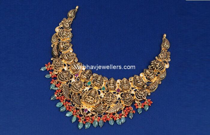 This Fancy Polki Necklace from Vaibhav Jewellers is a luxurious statement piece that showcases exquisite craftsmanship. Featuring intricate polki work and a beautiful design, this necklace is perfect for special occasions or festive celebrations, adding a touch of elegance and sophistication to any outfit. The detailed craftsmanship ensures that this piece stands out in any jewellery collection.